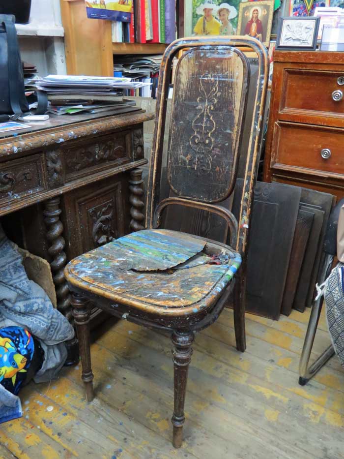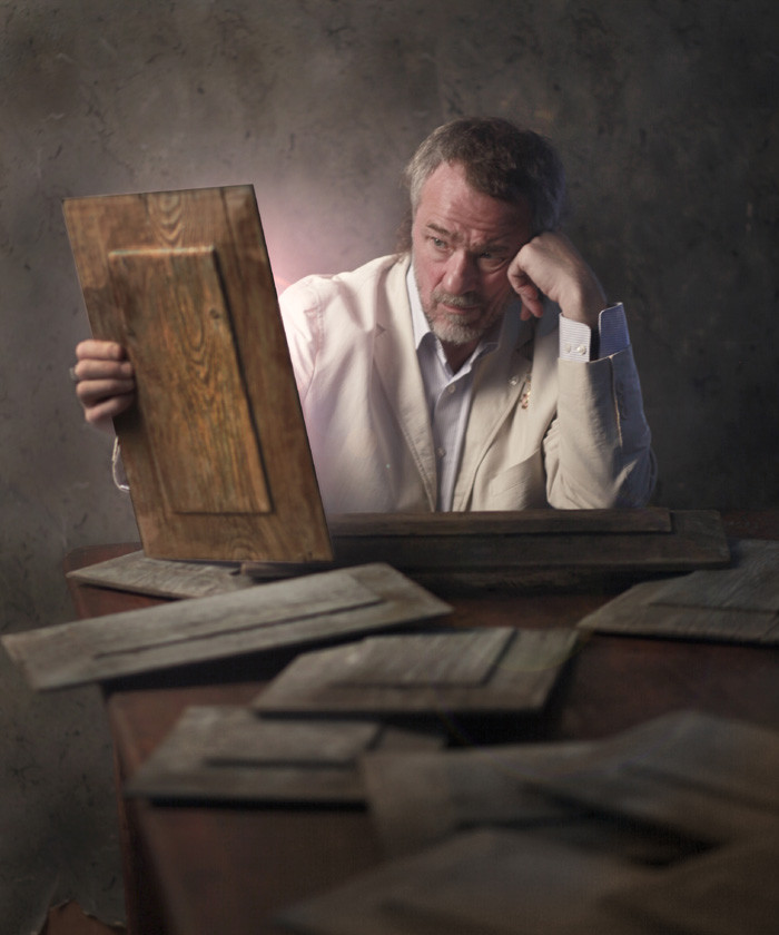 Тут недалеко ломали старую деревяшку и я успел утащить несколько старинных ставень. Показал художнику и он сразу завис над одной доской, а потом стал показывать и объяснять какие образы он увидел в этих деревянных причудливых линиях. Удивительная способность у человека наделять природную геометрию высокодуховными библейскими образами.